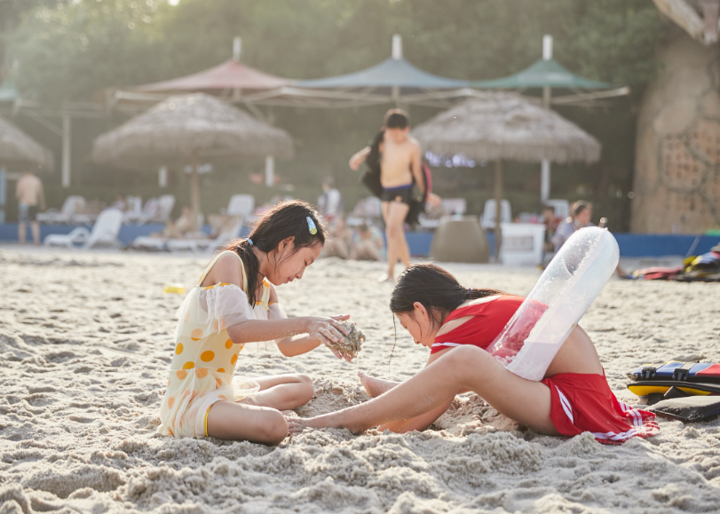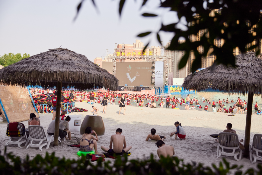从入园开始的遮阳棚,到白沙滩上的遮阳伞
